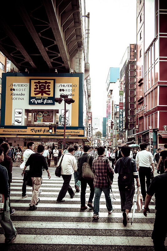 ทางม้าลายคนข้าม เหลืองๆ นั่นคือร้านขายยา Matsumoto Kiyoshi ที่สาวไทยชอบไปซื้อเครื่องสำอางกัน (มีหลายสาขามาก)