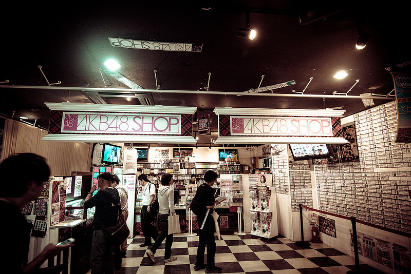 AKB48 Cafe & Shop อันนี้ด้านข้างซ้ายขวาจะเป็น shop ขายของ ด้านหนึ่งขายของเล็กๆ (เช่น พวงกุญแจ, ขนม) อีกด้านหนึ่งขายของชิ้นใหญ่กว่า (เช่น เสื้อยืด, แฟ้ม) ตรงกลางจะเป็นส่วนของ Cafe ซึ่งเข้าไปแล้วจะมีสองส่วน คือส่วนที่เหมือนร้านอาหารทั่วไป มีโต๊ะให้นั่ง มีทีวีแขวนให้ดู กับส่วนที่เป็นห้องด้านใน จะเป็นห้องขนาดใหญ่ มีทีวีจอยักษ์ น่าจะประมาณทีวี 50″ 9 จอต่อกัน เปิด PV สลับกับบันทึกการแสดงจาก Theater เวลาที่มี event อะไรก็จะเอาโต๊ะกินข้าวออกแล้วจัดงานที่ในห้องนี้แหละ